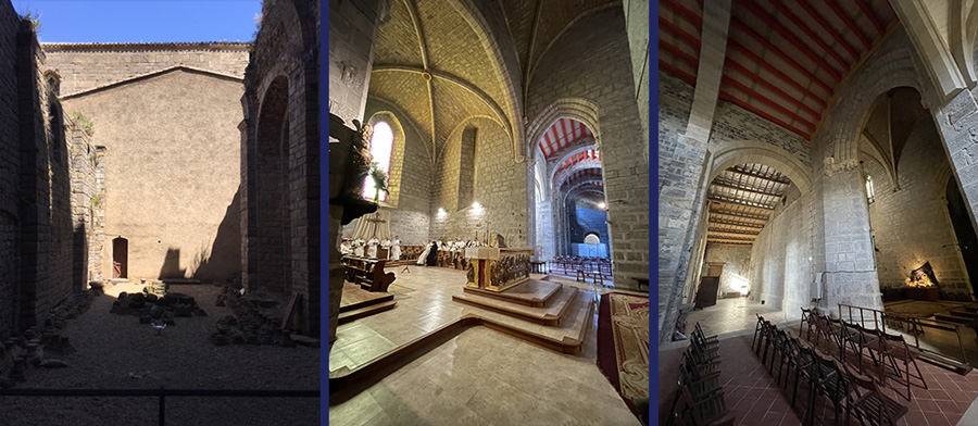 Peu avant Noël, la nef a pu être ouverte sur le bras sud du transept médiéval, donnant une impressionnante augmentation d’espace, de résonnance, de lumière et de beauté. Nous pouvons ainsi accueillir une centaine de fidèles supplémentaires sous des arcs refaits dans le plus pur style roman et une charpente peinte à la manière des plafonds médiévaux du village. Nous vous remercions pour votre générosité sans laquelle ces merveilles n’auraient pas été réalisables.